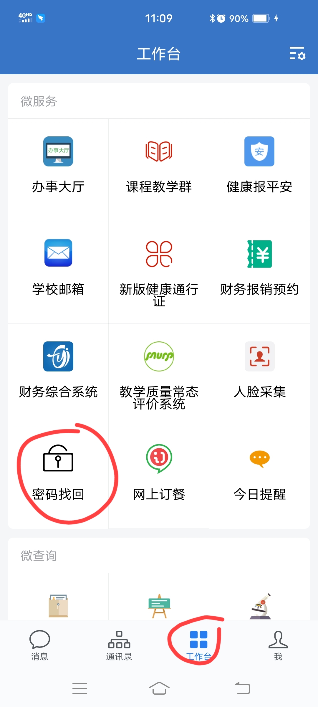 如忘记密码,可通过学校企业微信“工作台”界面上的“密码找回”功能找回: