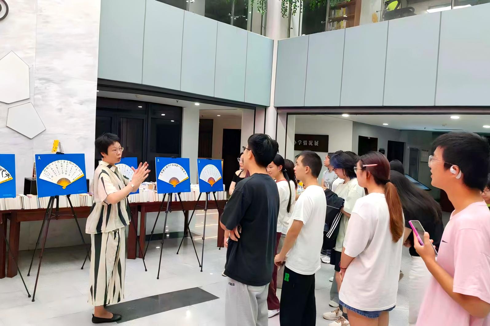 当晚,一场以“折扇里的家国情怀”为主题的思想政治教育课在展厅现场开讲。语言文学分院陈静老师以陆游“位卑未敢忘忧国”的诗句为引,结合扇面作品,引导学生深入思考文化传承与当代青年的责任担当。在场学生围绕“青春传承文化”展开热烈讨论,有同学分享道:“当我看到‘铁马冰河入梦来’的题字时,仿佛能触摸到陆游笔下那份炽热深沉的爱国情怀。”