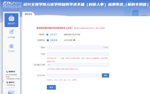 系统简介:“中国知网”科研人事论文检测系统,为机构内教师、科研人员提供论文检测服务。